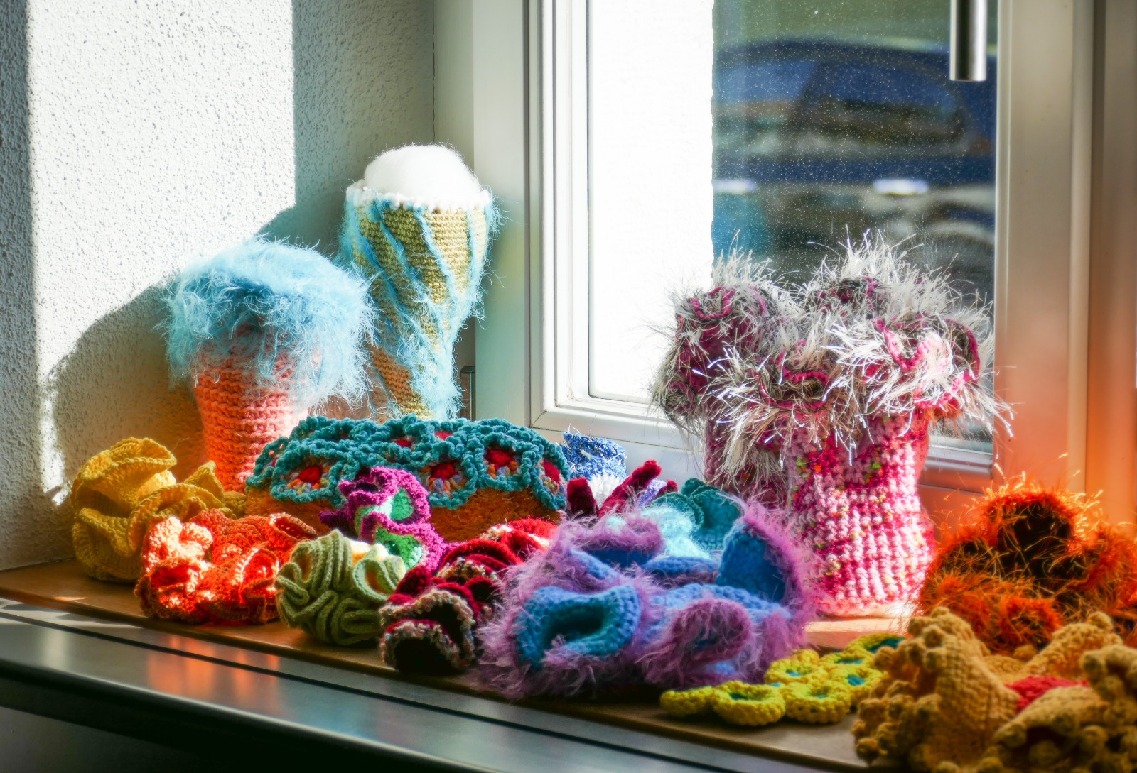 Noch immer ist das gehäkelte Korallenriff und die Ausstellung „Das Meer beginnt vor der Haustür“ in Furtwangen an der Hochschule zu Gast. Die Ausstellungszeiten sind 5. April – 2. Juni 2023, Montag – Freitag 9:00 – 14:00, Samstags von 10:00 – 13:00, Mensa der Hochschule Furtwangen, im Glaspavillon